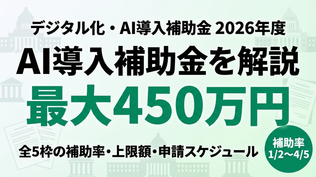 結論: デジタル化・AI導入補助金(旧IT導入補助金)は、中小企業がAIツールやITシステムを導入する際に最大450万円(補助率1/2〜4/5)を受給できる補助金です。2026年3月30日から交付申請が開始されます。