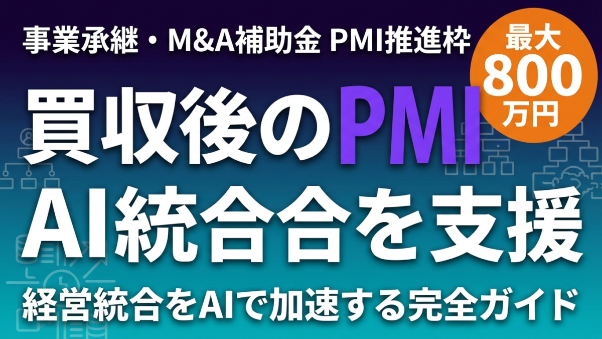 2026年2月27日に始まった第14次公募では、PMI推進枠が引き続き「PMI専門家活用類型」(上限150万円)と「事業統合投資類型」(上限800万円〜1,000万円)の2類型で公募されている。近年ではAIを活用した会計システム統合や顧客データ統合が注目されており、事業統合投資類型でのAIシステム導入費用も補助対象になる。