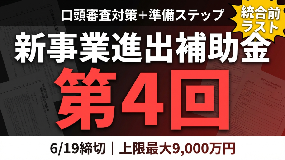 2026年3月27日、新事業進出補助金の第4回公募要領が公開されました。申請受付は5月19日から、締切は6月19日(金)18:00。第1回の採択率が約37%だったこの制度も、回を重ねるごとに競争が激化しています。